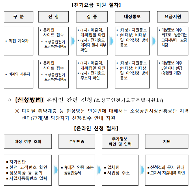 - 온라인 신청을 원칙으로 하며 포털사이트에서 "소상공인 전기요금 특별지원" 검색 또는 주소창에